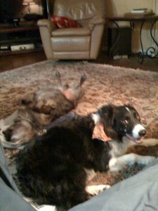 Written by admin on January 7th, 2009As always, I sent some clothes home with my dad so the dogs could smell my scent. My dad said that Guinness rolled in my clothes for about a half an hour–then he would pounce on them, and roll in them again. I think Jameson’s just pissed. He’s probably thinking, “I smell her, but I don’t see her, so these clothes mean nothing!!!!” Wait ’til next Friday, Jamie!! I’m a comin’ home, buddy!!
