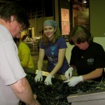 Brennon poured us tastings of several different Efeste wines, and we all chatted, learning about the wine, Brennon’s viticulture studies, the meaning behind the name (there are three owners, and one’s last name begins with “F” (hence “Ef”), another with “S” (thus “Es”), and the final with “T” (I think you can figure that one out). So, it’s pronounced F-S-T.) There, now you’re practically a wine connoisseur! :) We shared with him our reason for visiting Seattle and the Northwest, and we learned that one of the owners’ grandsons had acute leukemia. He was still undergoing treatment, but was doing well. Brennon created a wine in his honor! It will come out in 2011 (if I remember correctly), and is called “Tough Guy”. I love it!! Brennon led us through the winemaking areas, and mentioned they were harvesting some grapes that weekend, and would we like to help sort? Well, we’d never done that before, and our brains were slightly tinted with “Final Final”, “Jolie Bouche”, “Ceidleigh” (named after a waitress the owners once met in Australia) and “Big Papa” (so named for the big papa (or head of the family)). So, yes, our brains were tinted and we were so seduced by the thought of helping in the wine harvesting (or “crushing” in the wine biz), we quickly said we would help! Katie later changed her mind, deciding that standing for 6 or 7 hours sorting grapes was not her idea of fun on a vacation.Â